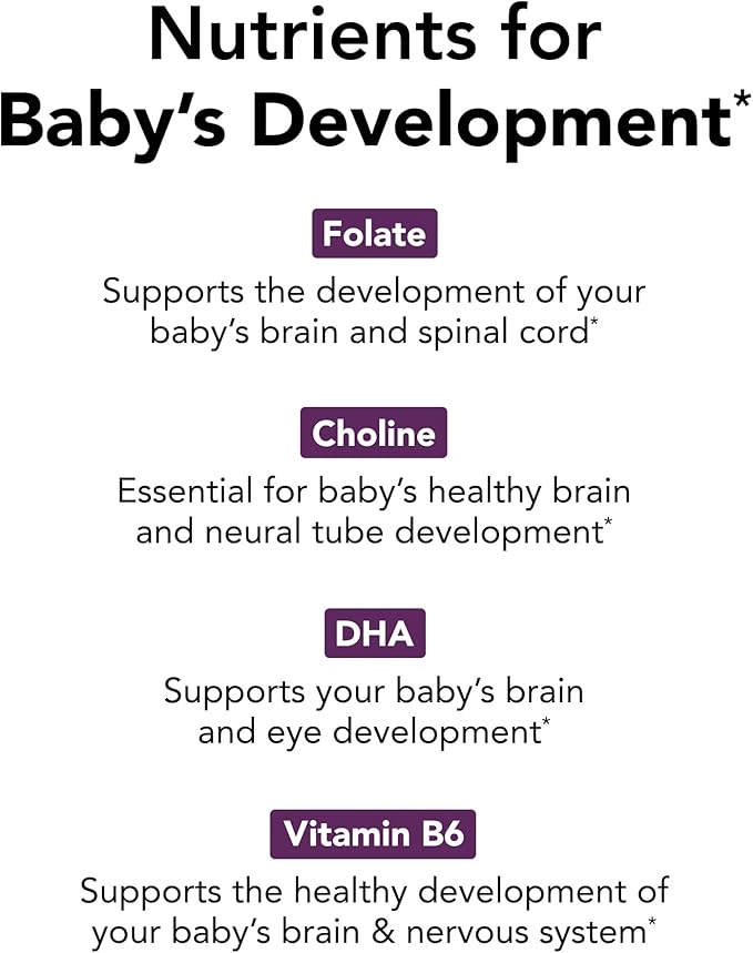 - Comprehensive Formula: 1 softgel and 2 tablets a day provide our most comprehensive formula for baby and mom, including 250 mg of choline, folate, and 300 mg of DHA to support your baby's brain development*