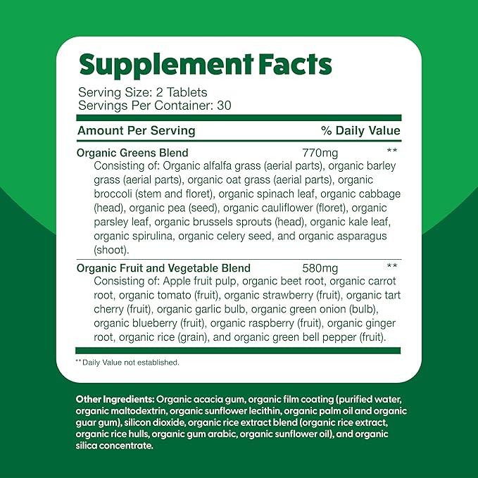 Feel Great Vitamins Super Greens Tablets | Organic Greens, Fruits and Veggies Supplement | Fruit and Veggie Supplement with Kale, Spinach Extract, Green Onion, and More, 60 Tablets