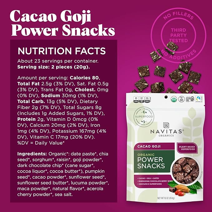 - Mighty tasty and supremely portable, Navitas Organics Cacao Goji Power Snacks bring together dates, seeds and premium superfoods to help you power through your day.