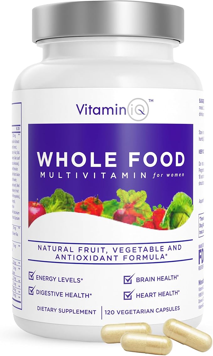 - Whole Food Vitamin for Daily Nutrition: Fuel a healthy lifestyle with VitaminIQ’s Whole Food Multivitamin, a capsule supplement made with 24 natural whole foods from nutritionally dense sources for women's ultimate nourishment including support for improved metabolism, energy levels, brain, and digestive health. Moreover, our multivitamin doesn’t use iron or synthetic folic acid - we use folate found naturally in whole foods for better nutrient absorption, making it ideal for women over 50.