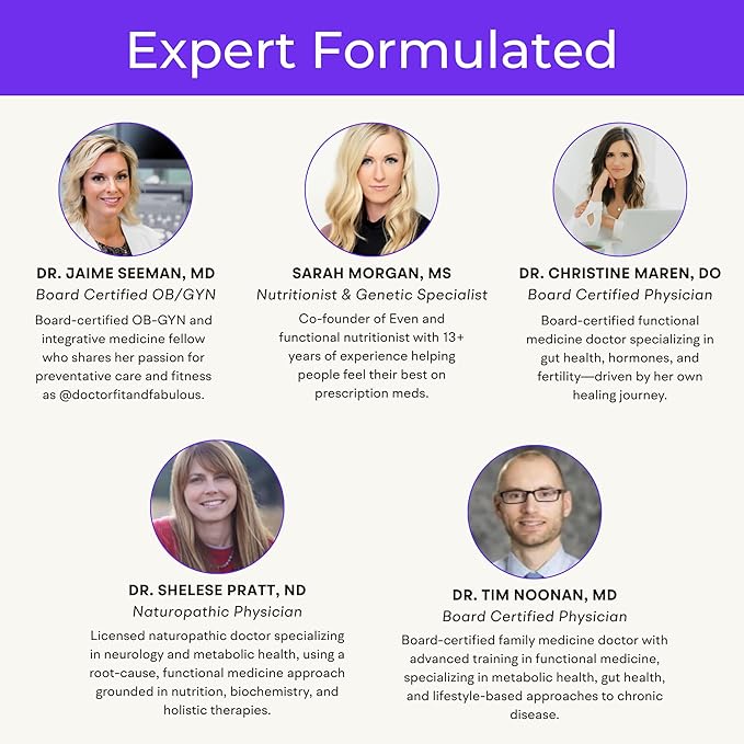 - Doctor-Formulated Supplements: These 100% vegetarian, easy-to-swallow capsules are designed by our dedicated scientific advisory team consisting of a board-certified obstetrician-gynecologist, a board-certified physician and founder of Functional Medicine Clinic, a nutritionist and CEO of Even Wellness Company, a Naturopathic Physician and Founder of Pratt Clinics, and a board-certified Family Medicine Physician at Allina Health.
