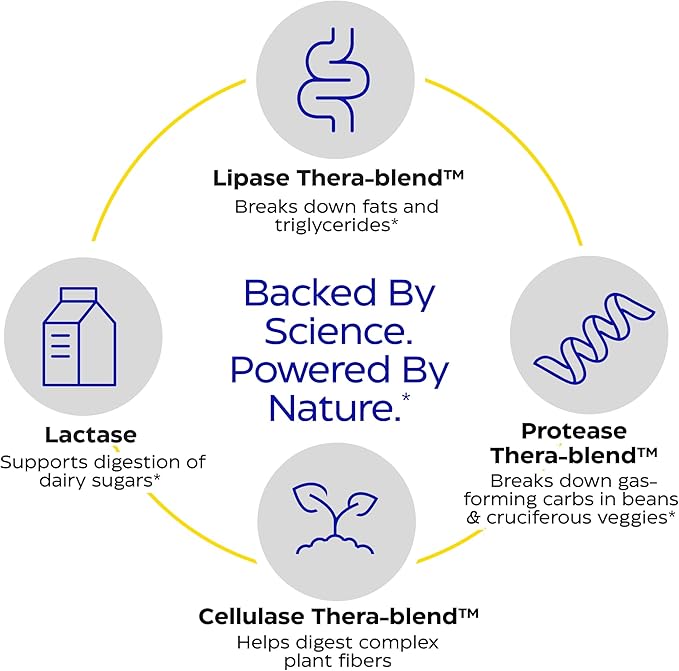 - COMPLETE ENZYME COVERAGE – Powered by Thera-blend, these advanced digestive enzymes remain active throughout the digestive tract to help break down proteins, fats, carbs , and fibers for daily digestive support and comfort.*