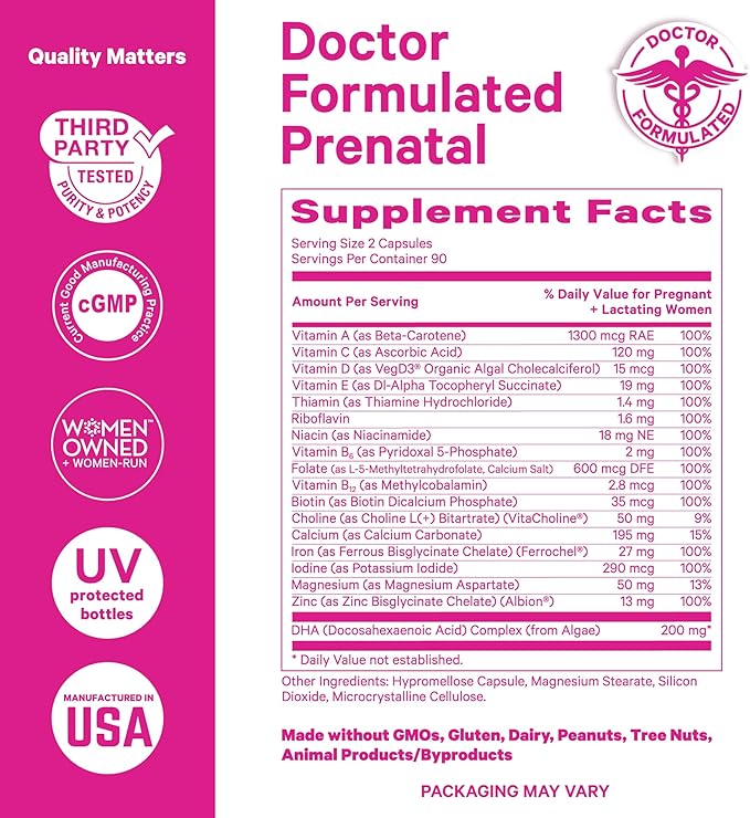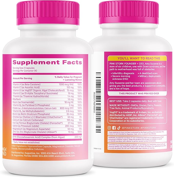 - Doctor-Recommended Nutrients for Full Pregnancy Support Pink Stork Total Prenatal with DHA delivers the essential nutrients you need before, during, and after pregnancy in one simple daily prenatal vitamin. Formulated with 100% of the daily value of 14 OBGYN-recommended nutrients, our supplement provides methylated folate (the natural, bioavailable form of folic acid), choline, iron, Vitamin D, zinc, B-complex vitamins including methylated B12 and B6, biotin, and omega-3 DHA. These ingredients support fetal development, immune function, red blood cell formation, energy levels, and overall pregnancy wellness.