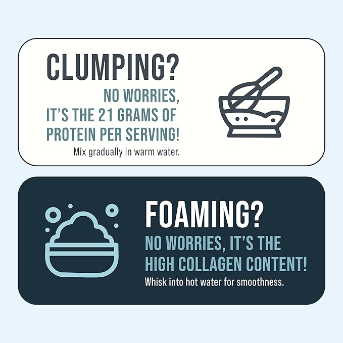 - FOAMING & CLUMPING: The presence of foam or clumps when mixing is a hallmark of high-quality bone broth protein. This reaction occurs because our formula is rich in intact, bioavailable collagen and gelatin, just like traditionally simmered bone broth—and delivers over 95% protein per serving. Many mass-market proteins use emulsifiers or flow agents to suppress this natural behavior—we don’t. We preserve the native structure of the protein for maximum nutritional integrity and functionality.