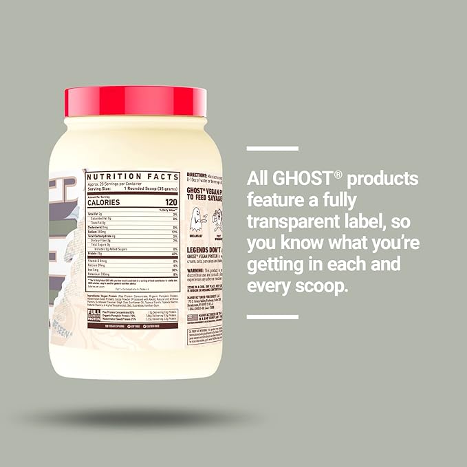 - 20G Vegan Protein: Every scoop of GHOST Chocolate Cereal Milk Vegan Protein contains 20G of pure, fully disclosed vegan protein. Flip the tub around for a breakdown of exactly how many grams of pea protein concentrate, organic pumpkin protein, and watermelon seed protein are in every scoop.