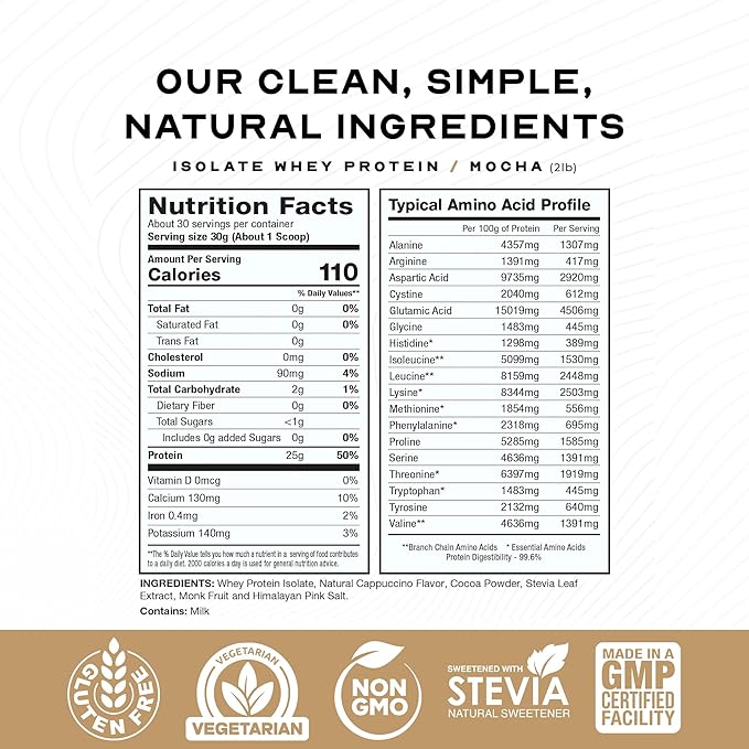 - LOW CARB AND LOW CALORIE: Grass fed whey isolate protein powder is suitable for those watching their macros. Our protein is STEVIA-SWEETENED, we do not add sugar or artificial sweeteners. Our product offers a pure stevia extract without erythritol, perfect for those who prefer a natural and healthy alternative to traditional sweeteners.