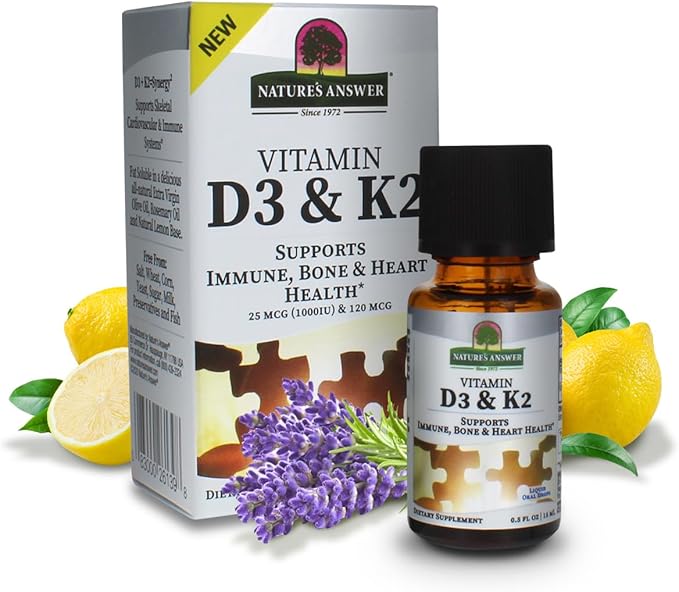 Natures Answer Vitamin D3 and K2, 0.5 oz - Liquid Extract Oral Drops - Supports Immune, Bone and Heart Health - in a Delicious Olive Oil, Rosemary Oil, and Natural Lemon Base