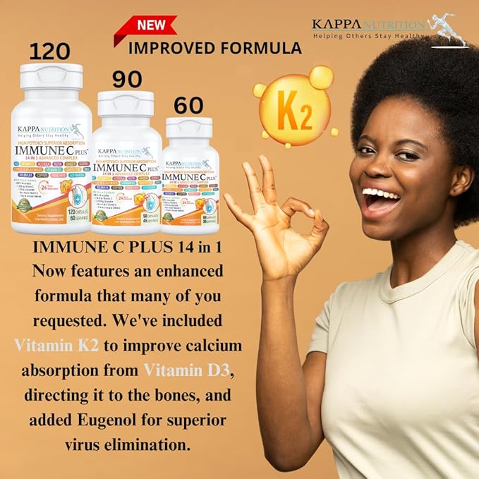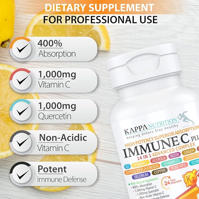 - Kappa Nutrition Immune C Plus immunity boost defense formula includes 14 ingredients: Non-Acidic Vitamin C, Zinc, Vitamin D3, Vitamin K2, Acerola, Ginger, Rutin, Bitter Orange, Rose Hips, Copper, Selenium, Quercetin, Echinacea, and Cloves. These ingredients work together to strengthen the body's defenses and provide extra immunity support year-round. This formula also promotes antioxidant activity, featuring powerful ingredients that help fight free radicals, protecting cells and enhancing immune health.