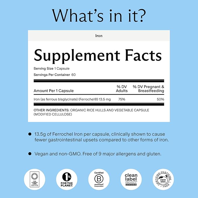 - EASY TO DOSE: Each capsule contains 13.5g of bioavailable elemental iron. This makes it easier to customize dosage. Take one capsule up to four times daily on an empty stomach, as advised by your health practitioner.