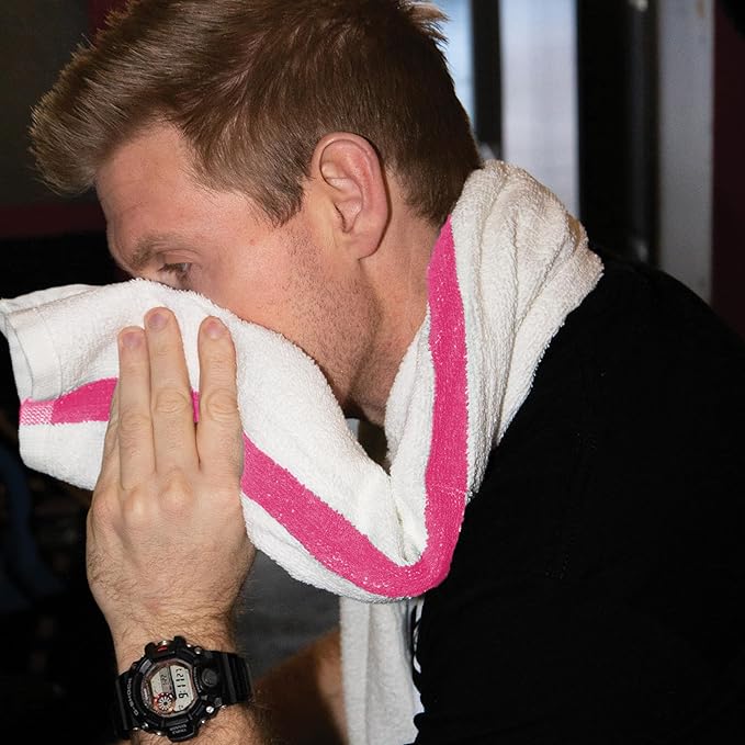 - POWER GYM BATH TOWEL VALUE PACKS: Pick up an economy set of 12 white 22" x 44" gym towels with a color center stripe. Our highly absorbent quick drying bath towels are available in plain white and blue, beige, pink, green, gold, and grey stripe.
