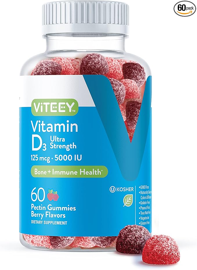 Viteey Vitamin D3 Gummies for Adults & Teens - 5,000 IU, 125mcg, Ultra Strength - Joint & Muscle Health, Immune Boost - Chewable Vitamin D Gummies - Vegetarian, Gelatin Free - Tasty Berry Flavored