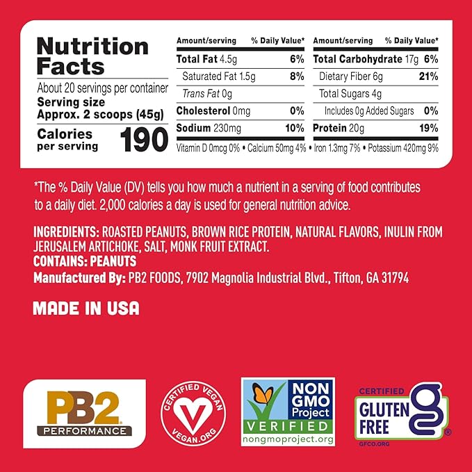 - SIMPLE, CLEAN INGREDIENTS: PB2 Performance has only seven simple ingredients that you can pronounce: Roasted Peanuts, Brown Rice Protein, Inulin, Natural Flavors, Salt, Monk Fruit Extract. Certified Non-GMO, Vegan, Vegetarian, Gluten Free and OU Kosher.