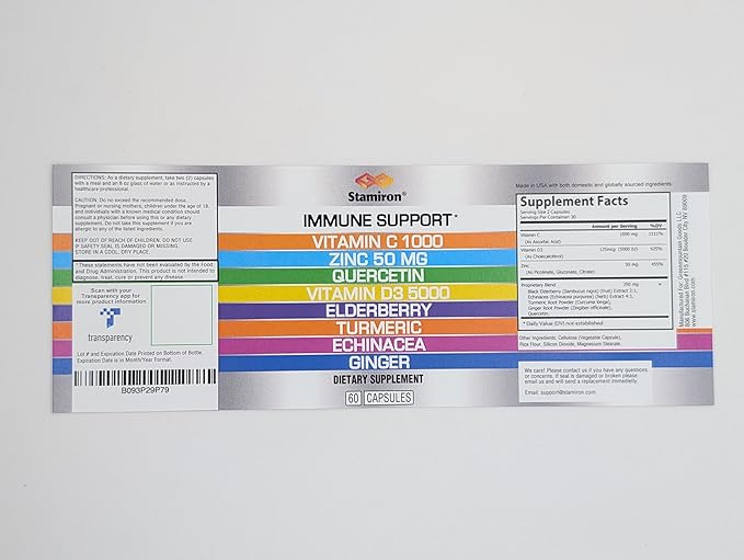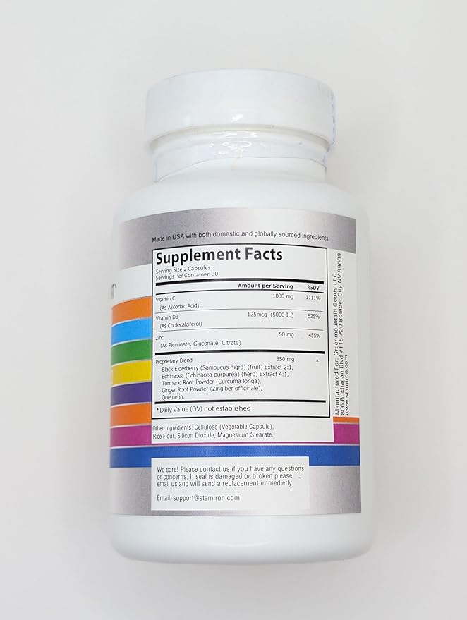 - The Best All-In-1 Immune Support Supplement On The Market - You no longer need to take 8 separate products to support your immune system. Now with just 2 capsules per day, you can get all 8 of most powerful immune health ingredients needed to stay help healthy. Our formula is stacked with 3 types of Zinc (Picolinate, Gluconate, Citrate) as well as 5000IU Vitamin D3, 1000mg Vitamin C, Quercetin, Elderberry, Echinacea, Turmeric & Ginger. Stamiron are the only complete Immunity Vitamins you'll need.