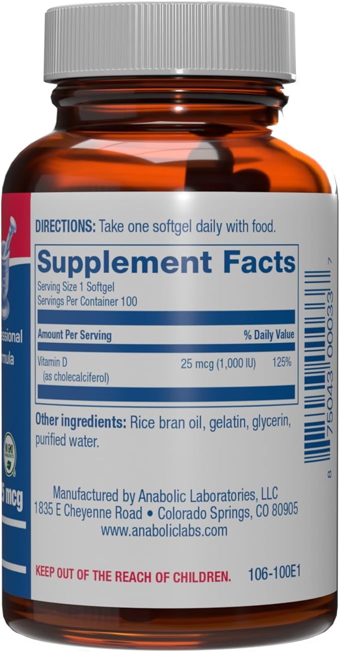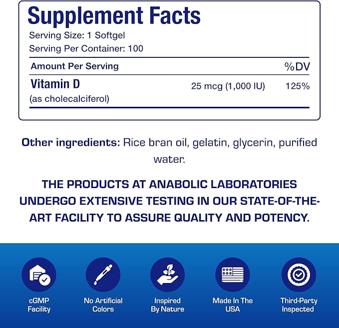 - Trusted Name Since 1924: Anabolic Laboratories has been committed to providing the highest quality nutritional products for 100 years and counting including our 1000 IU vitamin D3 softgels