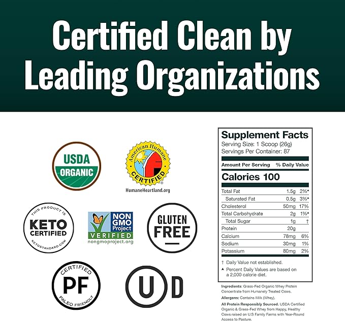 - Grass Fed Organic Whey Protein Powder – Impeccable quality, delicious taste, and only one ingredient: USDA organic, grass-fed whey protein. No sugar, sweeteners, additives, fillers, flavors, lecithin, or anything else. It is a “farm to shake” experience that can’t be beat!