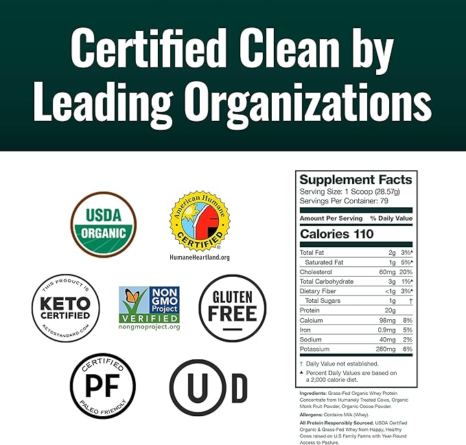 - Grass Fed Organic Whey Protein Powder – The original Organic Grass Fed Whey is now stevia-free and sweetened only with organic Monk fruit! Impeccable quality, delicious taste, and USDA organic, grass-fed whey protein. No additives, sugar, fillers, or lecithin. It is a “farm to shake” experience that can’t be beat!