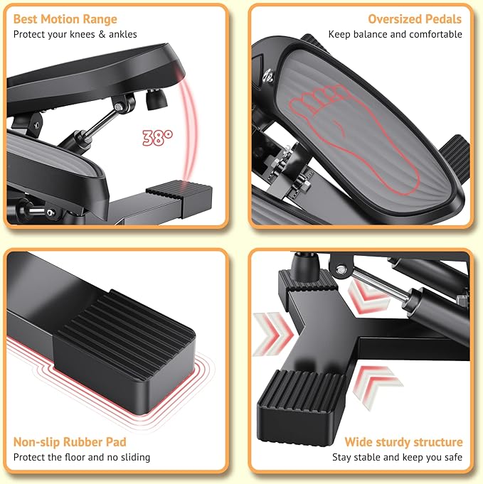 - 【Oversized Pedals & Best Motion Range】Our mini stair steppers use oversized pedals with silicone anti-skid pad as well as the skid-resistant floor protectors to keep your balance when you exercise. 38° step exercise motion range protects your knee and ankle.