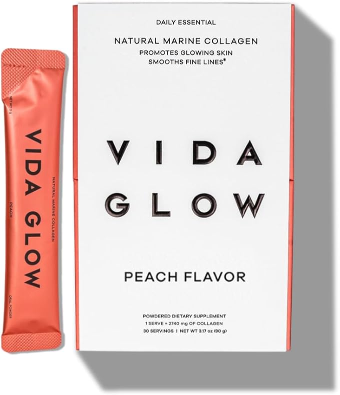 Vida Glow Marine Collagen Powder - Anti Aging Supplement with Collagen Peptides, Promotes Glowing Skin, Strong Nails, Healthy Hair | 30 Servings, Peach Flavor