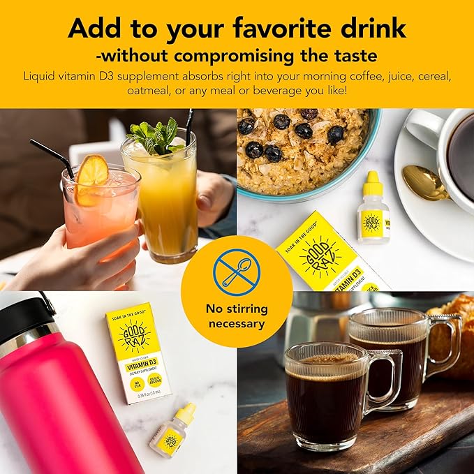 - QUICK SUPPORT - Vitamin D liquid drops for adults offer faster absorption and quicker support than oil-based drops and pills. Good Rāz vitamin D3 drops pack a powerful 1,000 IU per drop. Keep one bottle in the car or purse to take on the go. One small bottle lasts 4 full months!