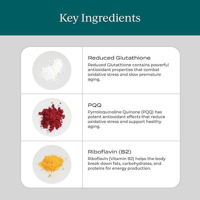 - PACKED WITH ANTIOXIDANTS: Our liquid glutathione contains reduced glutathione and pyrroloquinoline quinone (PQQ), both of which have powerful antioxidant properties that can reduce oxidative stress and support healthy aging.