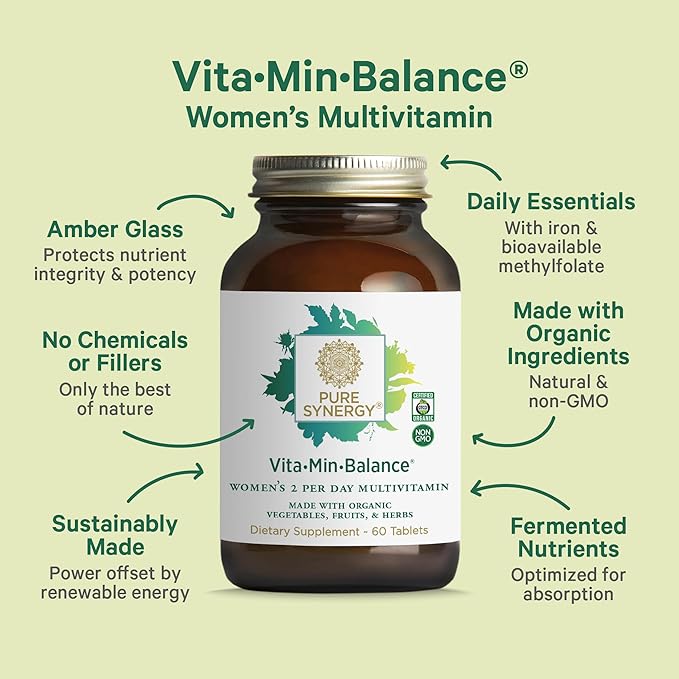 PURE SYNERGY Vita·Min·Balance | Multivitamin for Women with Iron | Women’s Daily Multivitamin Made with Organic Whole Foods | for Balanced Energy and Stress Support (60 Tablets)
