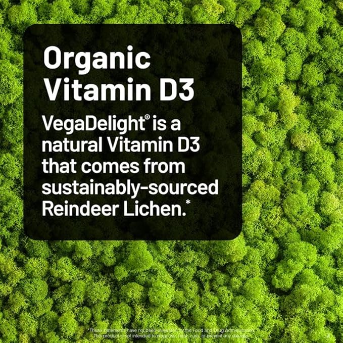 - ORGANIC VEGAN VITAMIN D3: Our Vegan Vitamin D3 is from VegaDelight, a Organic D3 from sustainably sourced Lichen, an algae that produces a natural, vegan and bioavailable vitamin D3.