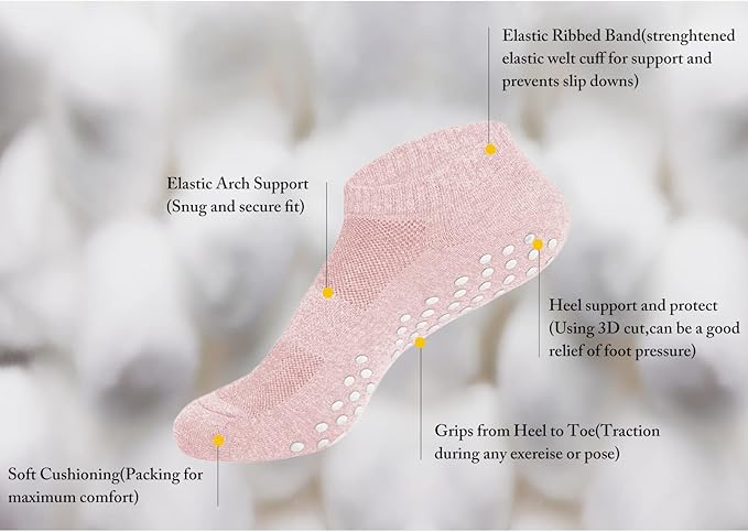 - COMFORTABLE & HOLD UP WELL: Say goodbye to tight and uncomfortable socks. Cozy ankle socks with lightweight and breathable fabric, grippy socks woman featured with toe stitching more softer and comfortable. Barre non slip socks featured in arch elastic to support to help to relieve pain and stay in place when your‘re exercising