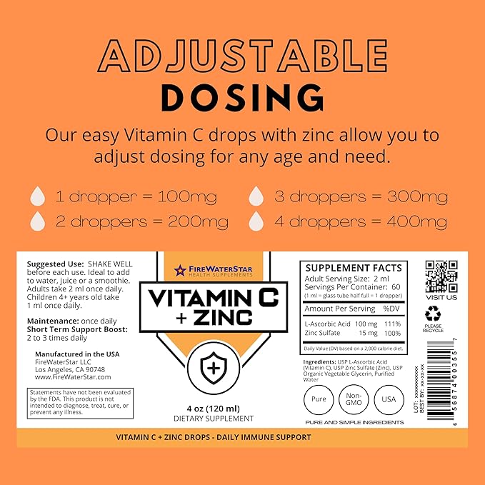 - LIQUID VITAMIN C DROPS WITH ZINC - Daily dosing is super easy and convenient with the provided dropper top. Two simple droppers provides an adult with a 111% daily value serving of Vitamin C and 100% of Zinc. For children it's one dropper. You can take it straight from the dropper, but it's ideal to add to water, juice or a smoothie, and you will taste very little to nothing. It's that easy!