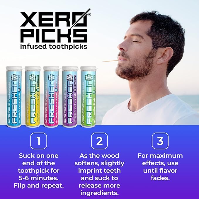 - Cooling icey sensation for Dry Mouth solution that begins to work as soon as they hit your mouth and will provide quick on the go relief! – Convenient and pocket-sized to help with mouth dryness and halitosis. Infused flavored toothpicks deliver a quick fix anytime. Perfect for travel, work and workouts.