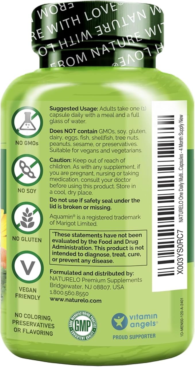 NATURELO Mens Multivitamins for Men 50+ - One Daily Multivitamin for Men with Vitamins, Minerals & Organic Whole Foods, Boost Energy & Health, Non-GMO, 120 Vegetarian Capsules