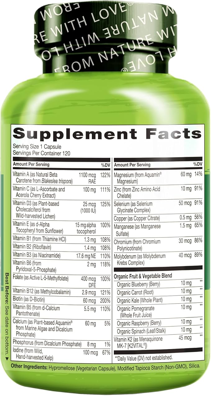 - PLANT-BASED: Featuring premium plant-based vitamins and minerals including as Vitamin D3 from lichen, Vitamin E from sunflower, plant Calcium and Magnesium from marine algae, and Iodine from kelp.