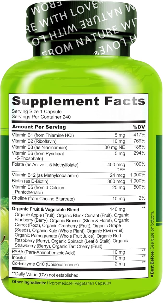 NATURELO Vitamin B Complex with Methyl B12, Methyl Folate, Vitamin B6, Biotin Plus Choline, CoQ10, and Fruit & Vegetable Blend - Supports Energy & Healthy Stress Response - Vegan - 240 Capsules