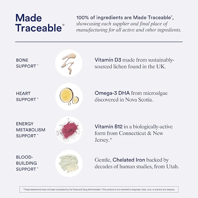 - MADE TRACEABLE: Our world-class scientists scoured the globe for high quality ingredients when formulating Essential for Women Multivitamin 18+. Our formula includes Vitamin D3 made from sustainably-sourced lichen found in the UK - for bone support, Omega-3 DHA from microalgae discovered in Nova Scotia - for heart support, Vitamin B12 in a biologically-active form from Connecticut - for brain support, and gentle, chelated Iron from Utah - for blood-building support.*