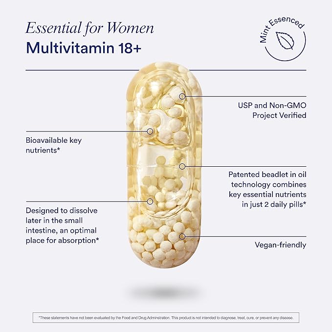 - PATENTED BEADLET IN OIL TECHNOLOGY: Essential for Women Multivitamin 18+ is so unique that the United States Patent and Trademark Office awarded us a patent (# US 11,083,738 B2). This technology keeps fat soluble and water soluble forms separated, within a single mint-essenced delayed release capsule designed for optimal absorption.