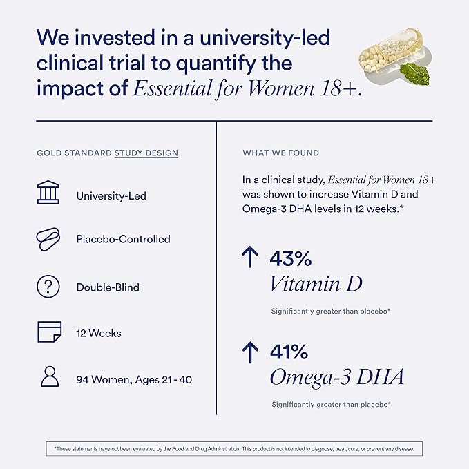 - PUBLISHED, PEER-REVIEWED CLINICAL STUDY: In a gold standard clinical study, Essential for Women Multivitamin 18+ was shown to increase Vitamin D, Omega-3 DHA, and Folate levels in 12 weeks. Our clinical study was published in Frontiers In Nutrition (Frontiers in Nutrition, Article 610382, July 2021) — a leading, internationally recognized, peer-reviewed journal.*