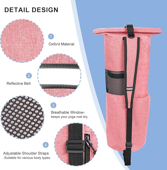 - [Superior Quality] Heavy duty yoga mat bag with tear resistant oxford and reinforcement stitching, perfect for yoga class, grassland, beach trips, park, etc.