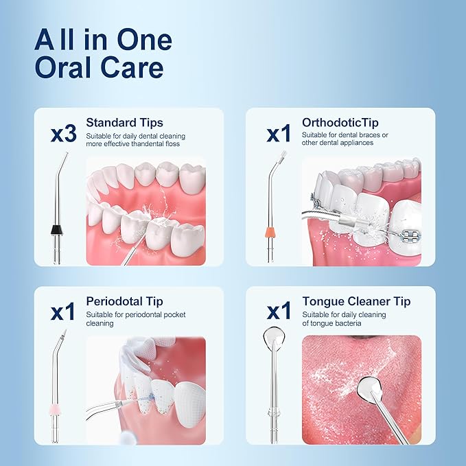- 【Powerful Water Teeth clean&Improving your gums】Equipped with a strong pump the water dentel flosser tooth cleaner has a strong water pressure pulses frequency of 2200-3000 times per minute, 50-150PSI brings powerful water flossing, protects the gums in the environment to achieve deep cleaning of teeth, effectively removes 99.9% of dental buildup, effectively massages the gums, helps with bleeding gums, bad breath, and beneficial for orthodontic bracket and bridge care.