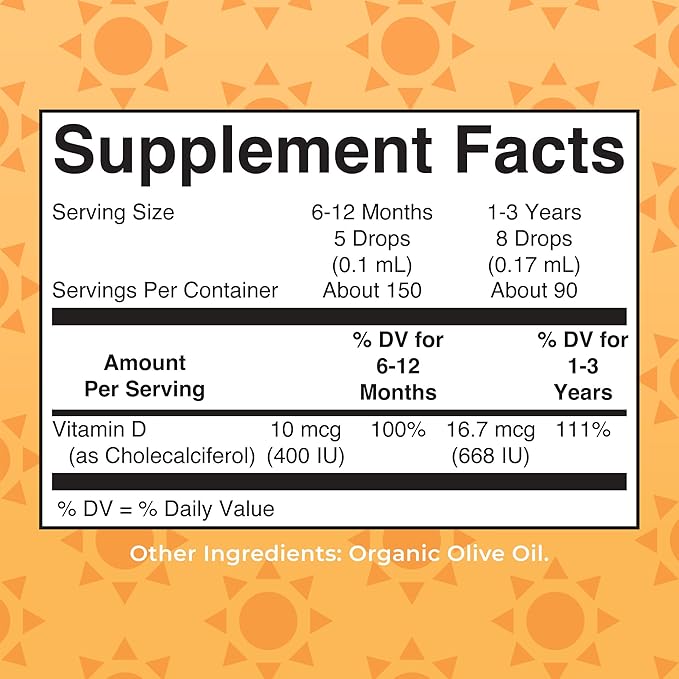 - Easy-to-Take Liquid Drops: This product was formulated for infants and toddlers, ages 6 months to 3 years old. Shake gently before use. Once daily, dispense drops directly into child's mouth, or add to food or drink. Infants (6 months-1 year): Up to 5 Drops/Daily, Toddlers (1-3 years): Up to 8 Drops Daily.