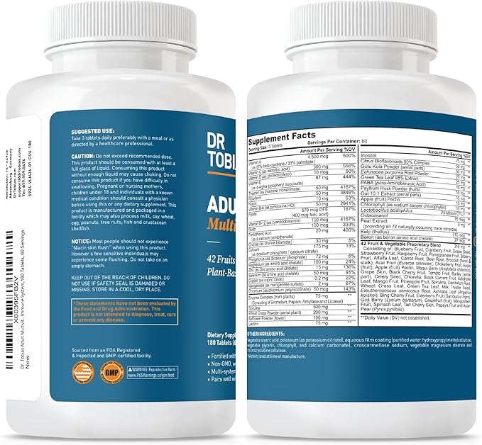Dr. Tobias Adult Multivitamin for Women & Men, Immune Supporting Vitamins from 42 Fruits, Vegetables, Plus Probiotics, Vegan Multivitamins for Men & Women, Non-GMO, 180 Tablets, 60 Servings