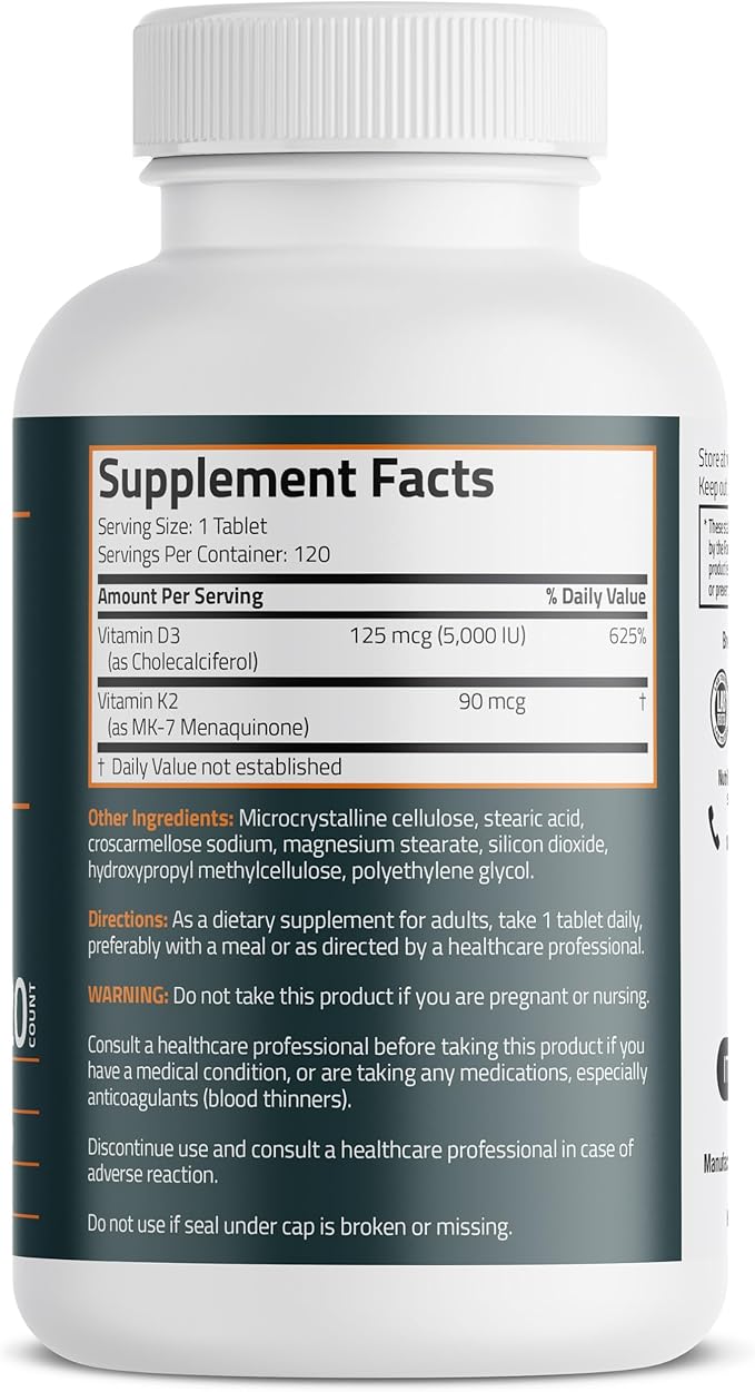 - High Quality & Great Value: Bronson Basics K2 + D3 provides 90 MCG of Vitamin K2 as MK-7 and 5000 IU of Vitamin D3 per tablet. We strive to support your good health and well-being through high quality supplements at the best value.