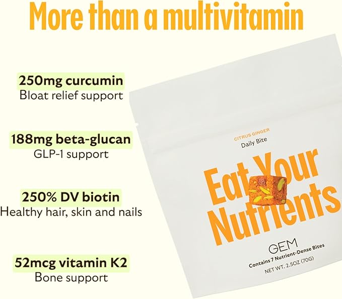 GEM Daily Multivitamin for Women & Men, 20+ Vitamins & Minerals zinc, Vitamin D, B, K, Folic Acid, Turmeric, Beta Glucan GLP-1 booster, Supports Gut, Skin, Brain, Immunity (Citrus Ginger, 28 Servings)