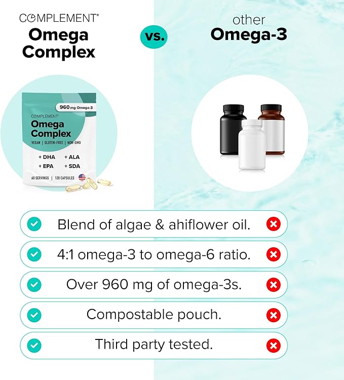 Complement Vegan Omega 3 Supplement- 960mg Omega-3 Fatty Acids, DHA, EPA, SDA, ALA Supplement - Immune Support- 60 Servings, 120 Liquid Capsules