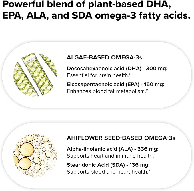 - PLANT-BASED NUTRIENT SUPPORT: A balanced blend of vegan-friendly omegas designed to complement a well-rounded diet. Crafted to help maintain your overall well-being, using pure, quality plant-based sources.