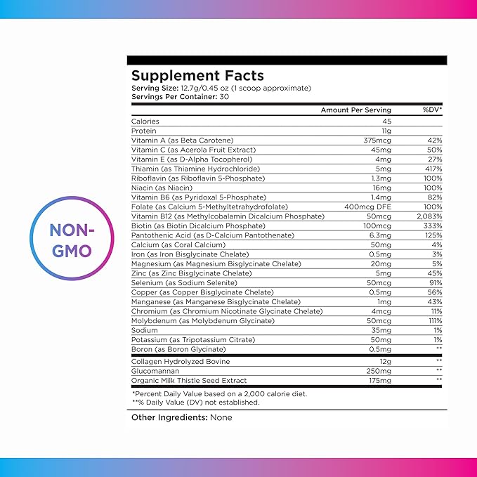 - Special Ingredients : Vitamin A (as Beta Carotene), Vitamin C (as Acerola Fruit Extract), Vitamin E (as D-Alpha Tocopherol), Thiamin (as Thiamine Hydrochloride), Riboflavin (as Riboflavin 5-Phosphate), Niacin (as Niacin), Vitamin B6 (as Pyridoxal 5-Phosphate), Folate (as Calcium 5-Methyltetrahydrofolate), Vitamin B12 (as Methylcobalamin Dicalcium Phosphate), Biotin (as Biotin Dicalcium Phosphate), Pantothenic Acid (as D-Calcium Pantothenate), Calcium (as Coral Calcium), Iron (as Iron Bisglycinate Chelate), Magnesium (as Magnesium Bisglycinate Chelate), Zinc (as Zinc Bisglycinate Chelate), Selenium (as Selenium Chelate), Copper (as Copper Bisglycinate Chelate), Manganese (as Manganese Bisglycinate Chelate), Chromium (as Chromium Nicotinate Glycinate Chelate), Molybdenum (as Molybdenum Glycinate), Sodium, Potassium (as Tripotassium Citrate), Boron (as Boron Glycinate), Collagen Hydrolyzed Bovine, Glucomannan, Organic Milk Thistle Seed Extract Vitamin A (as Beta Carotene), Vitamin C (as Acerola Fruit Extract), Vitamin E (as D-Alpha Tocopherol), Thiamin (as Thiamine Hydrochloride), Riboflavin (as Riboflavin 5-Phosp… See more