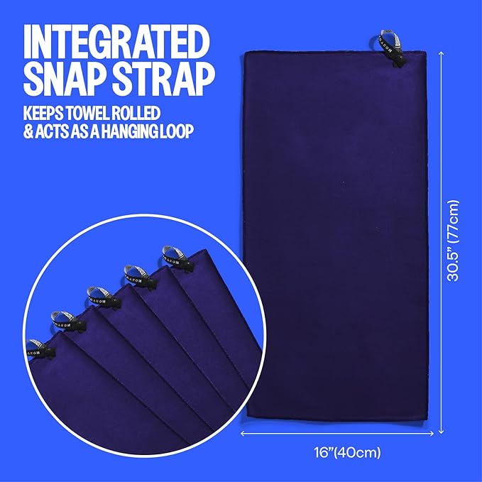 - ULTRA COMPACT, LIGHTWEIGHT, STAY CLEAN WITH HANGING LOOP: With an integrated snap strap closure that doubles as a hanging loop over the door, your backpack, or bottle. the large thin towel rolls up into a packable travel-friendly size. Perfect for anyone who travels light.