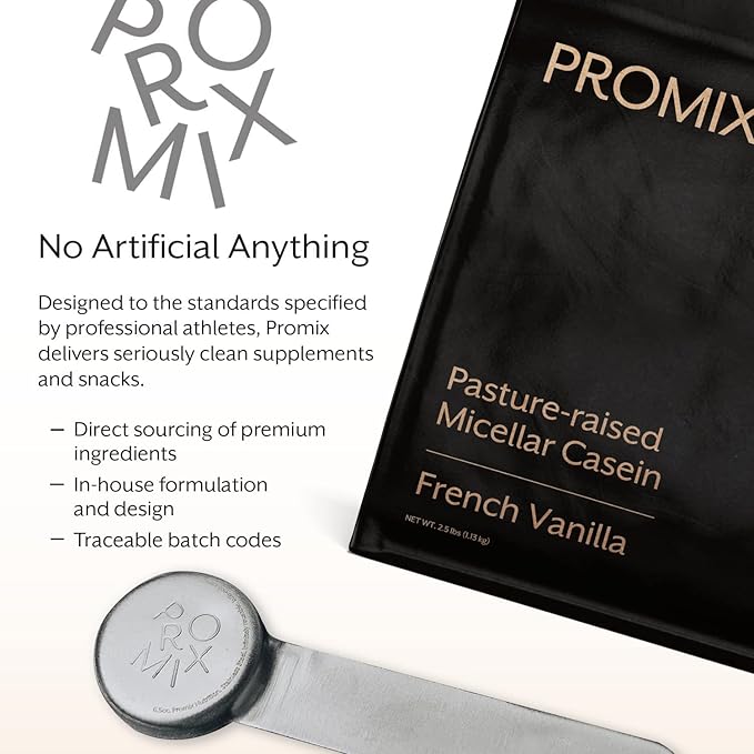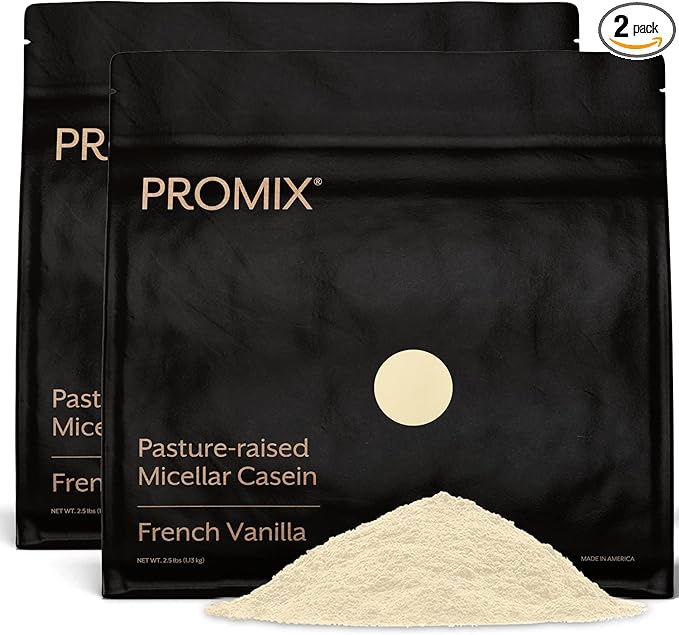 - Slow and Sustained Recovery: Promix Casein Protein Powder is a cold-processed and acid-free bioactive native casein made from milk of grass-fed cows. This lightly sweetened powder contains highly branched alpha/beta/kappa-proteins for a sustained release of amino acids for bedtime use, as well as sunflower lecithin for improved absorption and blending. Vanilla flavor. 64 servings per container, 2 scoops per serving.