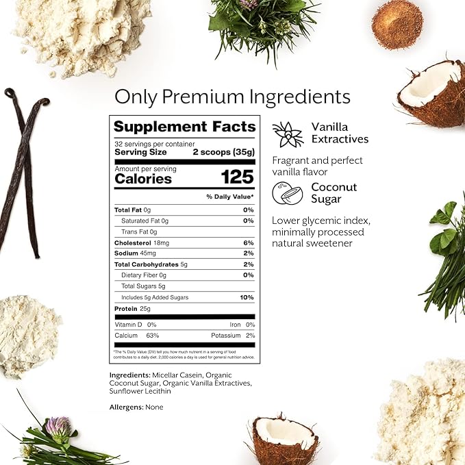 - Whole Food-Based Ingredients: Made of grass-fed micellar casein, sunflower lecithin (naturally high in phosphatidylcholine), vanilla extractives, and coconut sugar (lower glycemic index, minimally processed natural sweetener). That’s it.