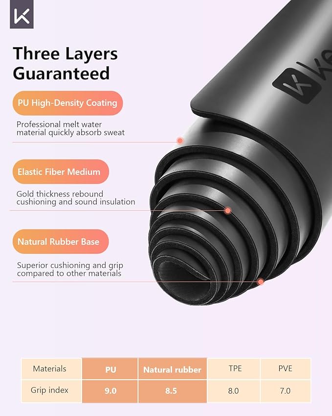- 7.7 lbs Weight (High-Quality PU + Natural Rubber): Dense 3-layer design ensures stability. PU top layer absorbs sweat with anti-slip grip; elastic fiber mid-layer boosts durability; natural rubber base delivers unmatched traction. Heavyweight construction enhances grounding for yoga, Pilates, and fitness, prioritizing professional stability over portability