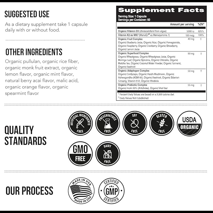 Organic Plant D3 + K2 | 5000 iu D3 + 120 mcg K2 as All-Trans MK7 from MenaQ7® - 100% Whole Food, Raw & Vegan | Enhanced Digestion with Prebiotic & Superfood Complex – D3 from Organic Algae (60 Count)