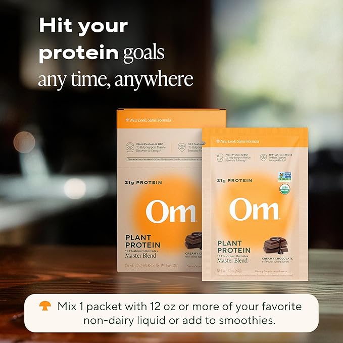 Om Master Blend Vegan Protein Powder, Chocolate, 21g of Plant Protein - Organic Mushroom Supplement with 10 Mushroom Complex, Ashwagandha, BCAAs and Vitamin B12 - Single Serve (10 Count)